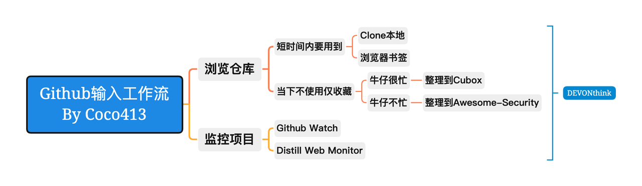 Github是我比较高频的信息获取渠道,由于之前顺手 Fork 积压了不少仓库,管理起来比较麻烦,并且事后也基本都没有再看过、查找也不方便,所以 GitHub 更多只是用来项目浏览和仓库更新提醒,不做收藏。遇到感兴趣的项目打标签放到 Cubox 或者直接整理到 DEVONthink Awesome-Security,方便需要的时候能快速找到某个项目或某类项目集。