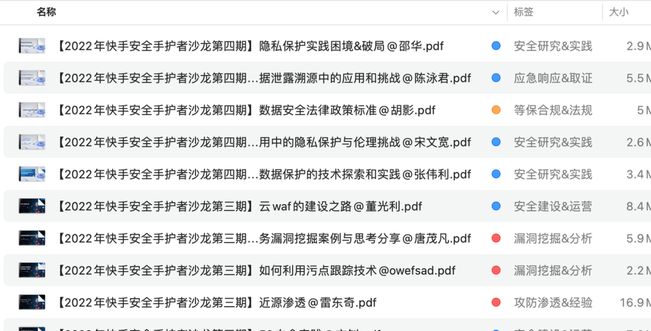 在技术类文档管理上,习惯重标签轻分类,即所有的文档都放在一个目录下,通过命名方式 + 标签进行管理,同时用标签自带的颜色区分属性大类,如红队、蓝队。