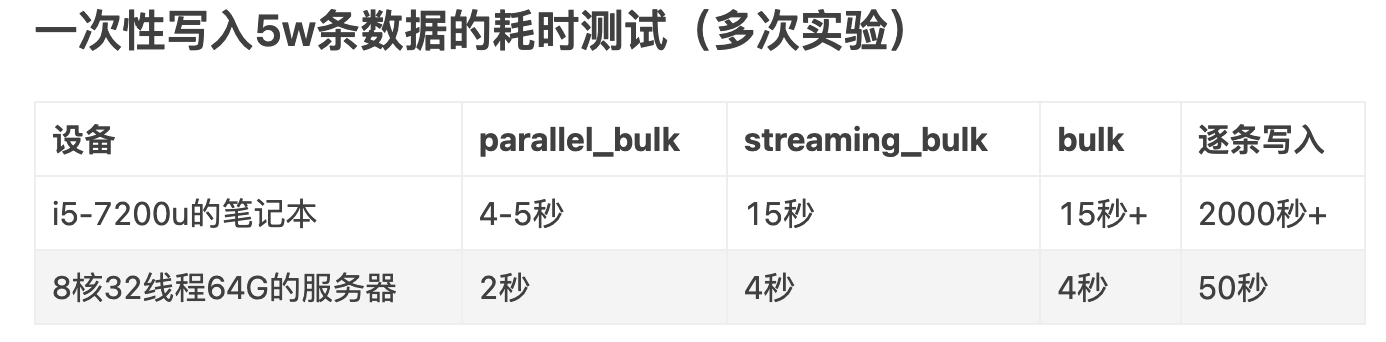 }同时用buk或streaming_bulk批量写的方式,目前主要用的streaming_bulk基本能够达到数据录入的时间、文档的要求。根据不同场景、侧重需求情况,可以参考py-elasticsearch的stream_bulk、parallel_bulk、bulk性能对比作者给出的测试结果选择适合的批量写入的方式。